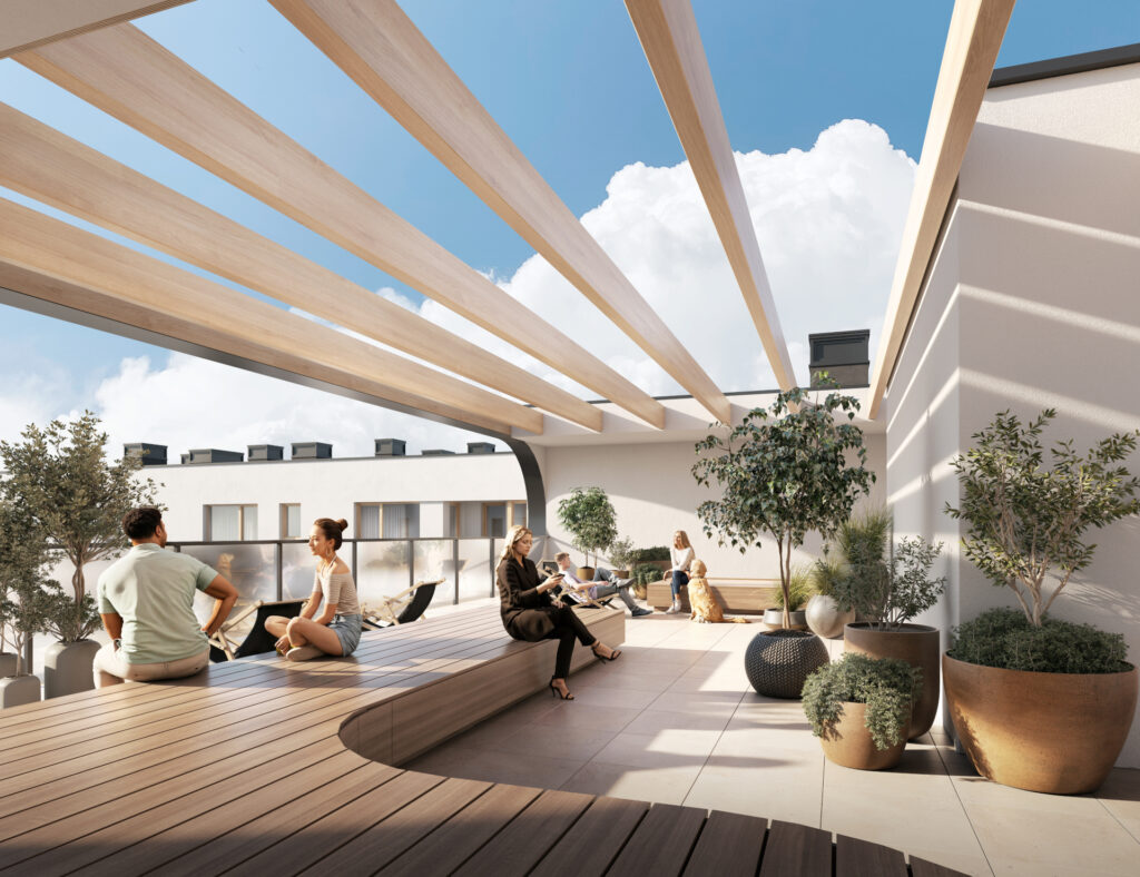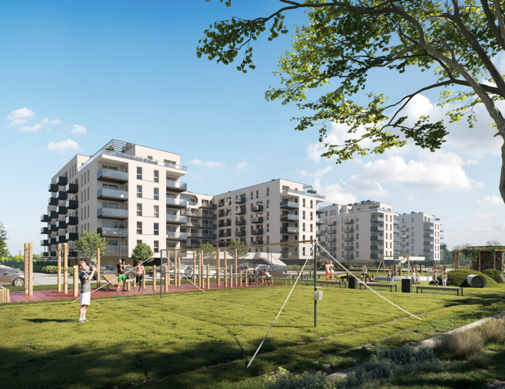 Z myślą o potrzebach mieszkańców powstały liczne przestrzenie wspólne m.in. zielony dziedziniec z dekoracyjnymi nasadzeniami sezonowych roślin a także przestronny taras zlokalizowany na dachu. Dla najmłodszych oraz osób ceniących aktywny styl życia przygotowano przestrzeń do zabawy i aktywności – bezpieczny plac zabaw, funkcjonalną siłownię plenerową oraz boisko do siatkówki.